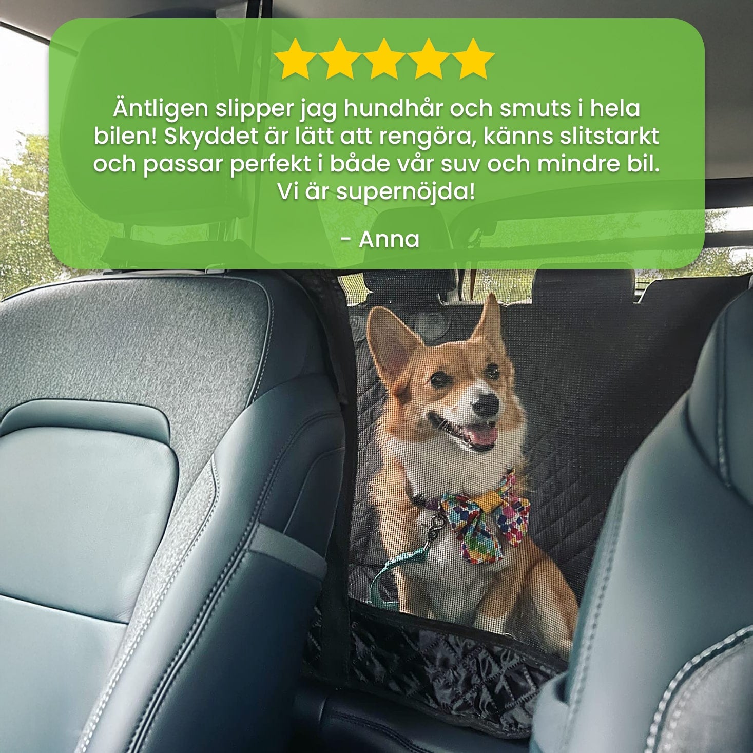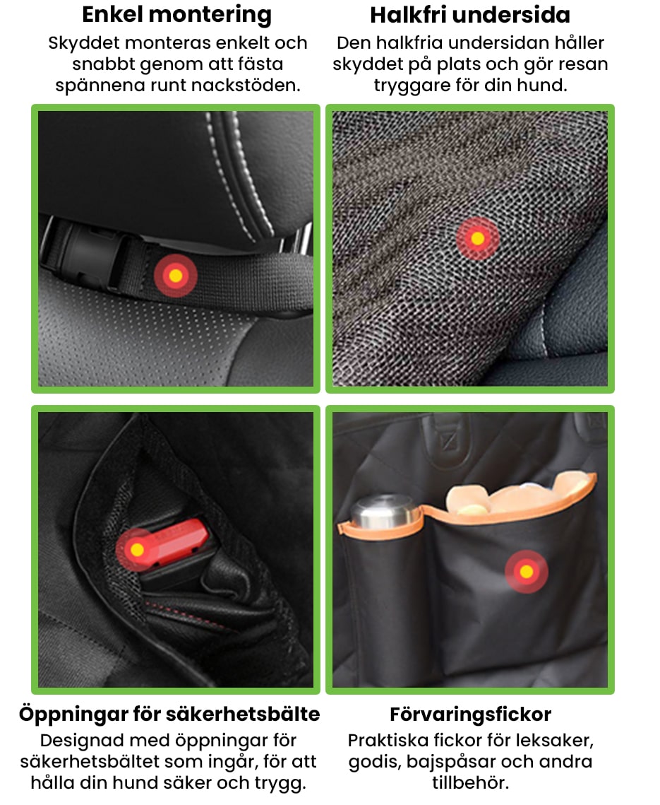 Skyddet sätts upp snabbt genom att klicka fast spännena runt nackstöden. Hunden spänns tryggt fast med bilbältet som ingår – sen är det bara att åka och njuta av en ren bil.